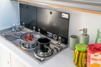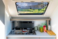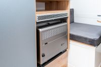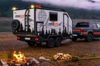 This unique trailer is dedicated to all adventure and travel lovers for whom freedom, comfort and functionality play an important role. In the living area there is a kitchen module where a gas cooker and a sink are available. A refrigerator is also integrated. In the bathroom there is a toilet and a washbasin, for showering there is an outside shower. The sleeping berth in the Black Road is fixed and for the second sleeping berth it is sufficient to lower the table and provide it with cushions. In the rear area there is a ladder and a spare wheel for emergencies. The roof is equipped with both a railing and a roof rack.