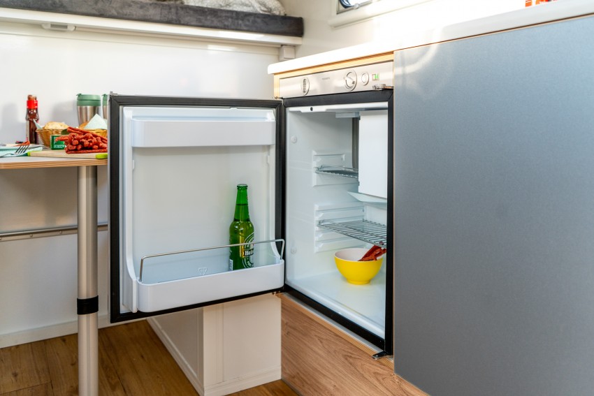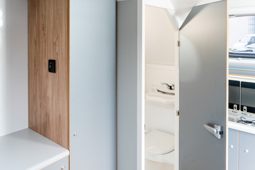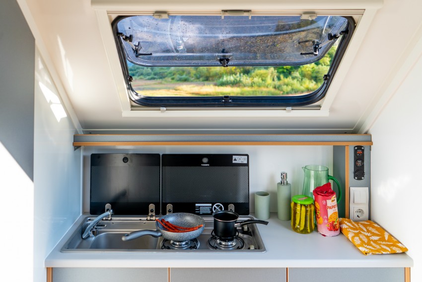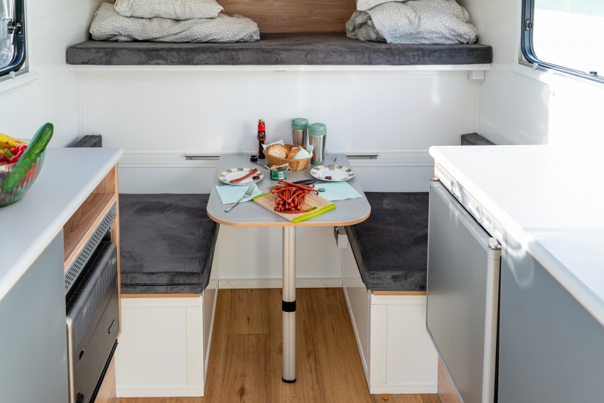 The compact caravan trailer is optimally designed for camping trips.